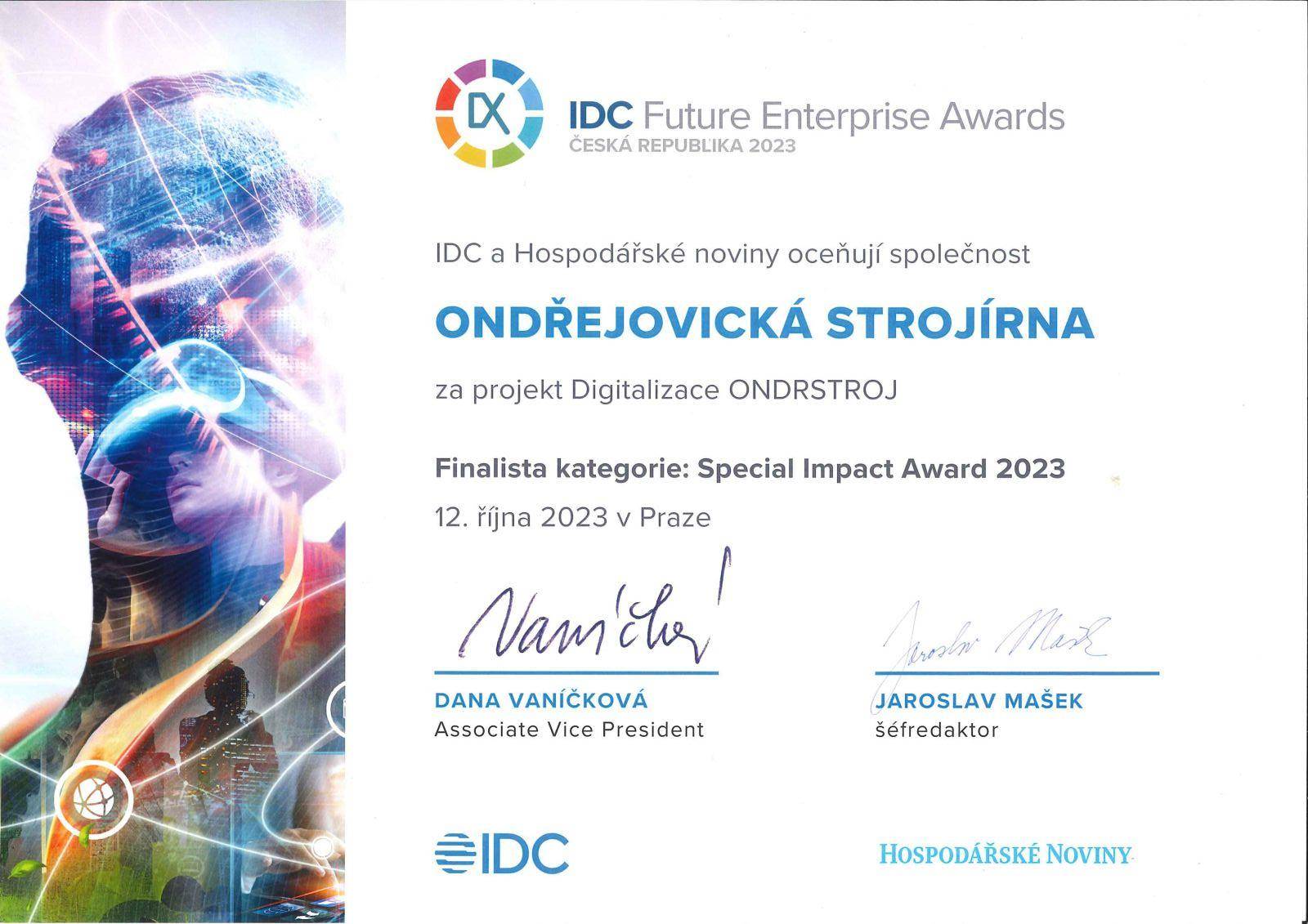 IDC Future Enterprise AwardsSkvělé zprávy z historicky prvního ročníku soutěže IDC! V předchozím článku jsme zmínili, že nás porota soutěže IDC Future Enterprise Awards navrhla na speciální ocenění v soutěži Hospodářských novin. Náš projekt Digitalizace ONDRSTROJ se v této soutěži umístil na krásném 2. místě! Oficiálního vyhlášení, které probíhalo 12.10.2023 v Praze, se zúčastnili zástupci OS – Dita Hricová a Ing. Martin Čmarada, který se tomuto projektu věnoval. Zde naleznete výsledkovou brožuru s příběhy oceněných lídrů a projektů.